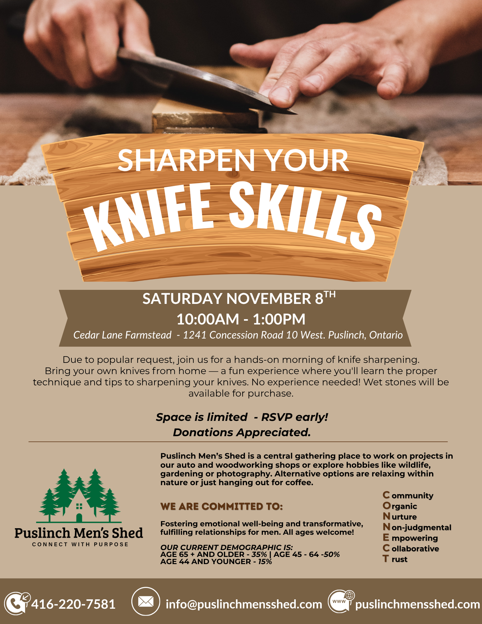 Sharpen Your Knife Skills with us at Puslinch Men’s Shed! Learn how to keep your blades razor-sharp, safe, and ready for any task. In this workshop, you’ll discover the techniques professionals use to maintain their knives — from understanding blade angles and honing tools to mastering the art of using a whetstone.