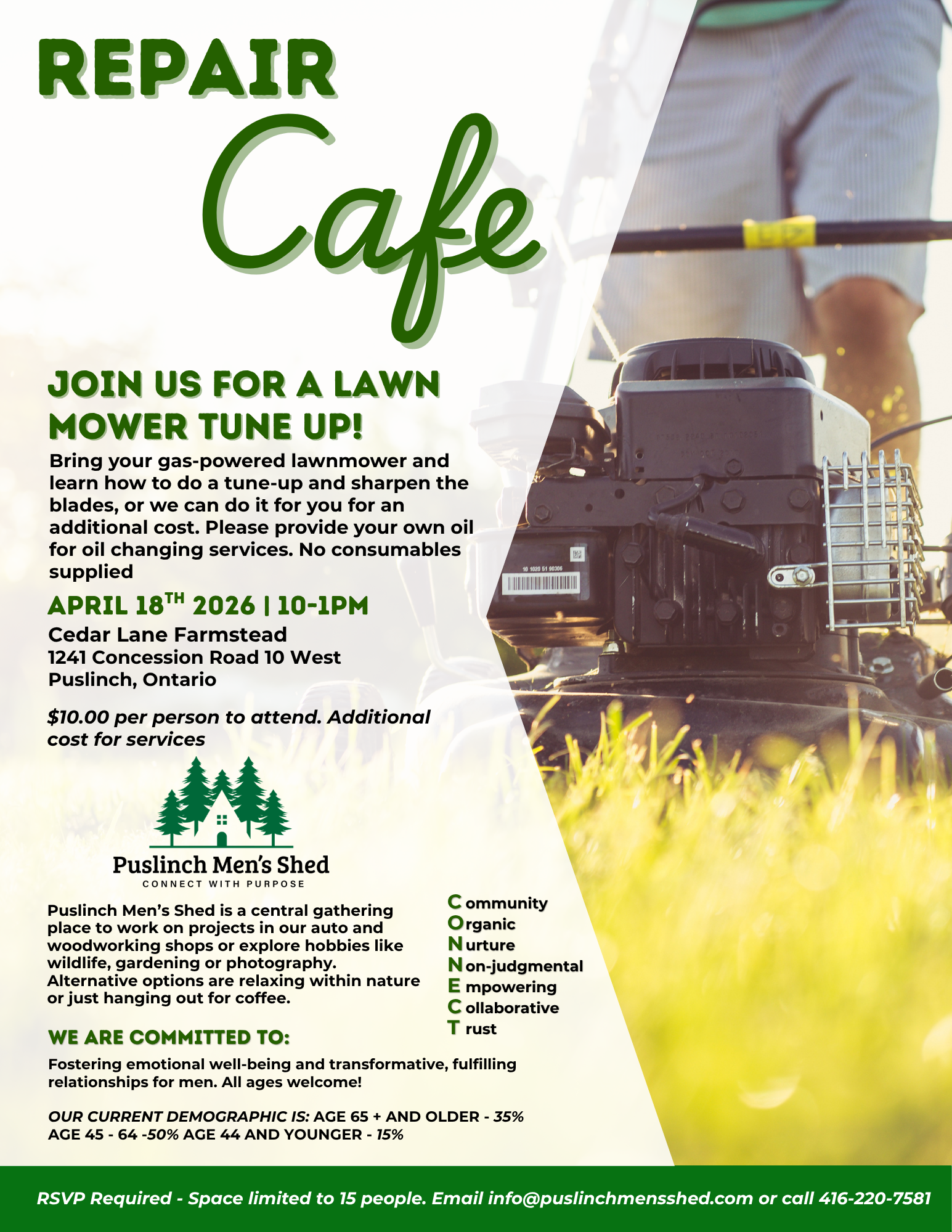 Back to All Events Repair Cafe Saturday, April 18, 2026 11:00 a.m. 3:00 p.m. Google Calendar ICS Bring your gas-powered lawnmower and learn how to do a tune-up and sharpen the blades, or we can do it for you. Come discover how you or someone you know can get involved with our Men’s Shed.